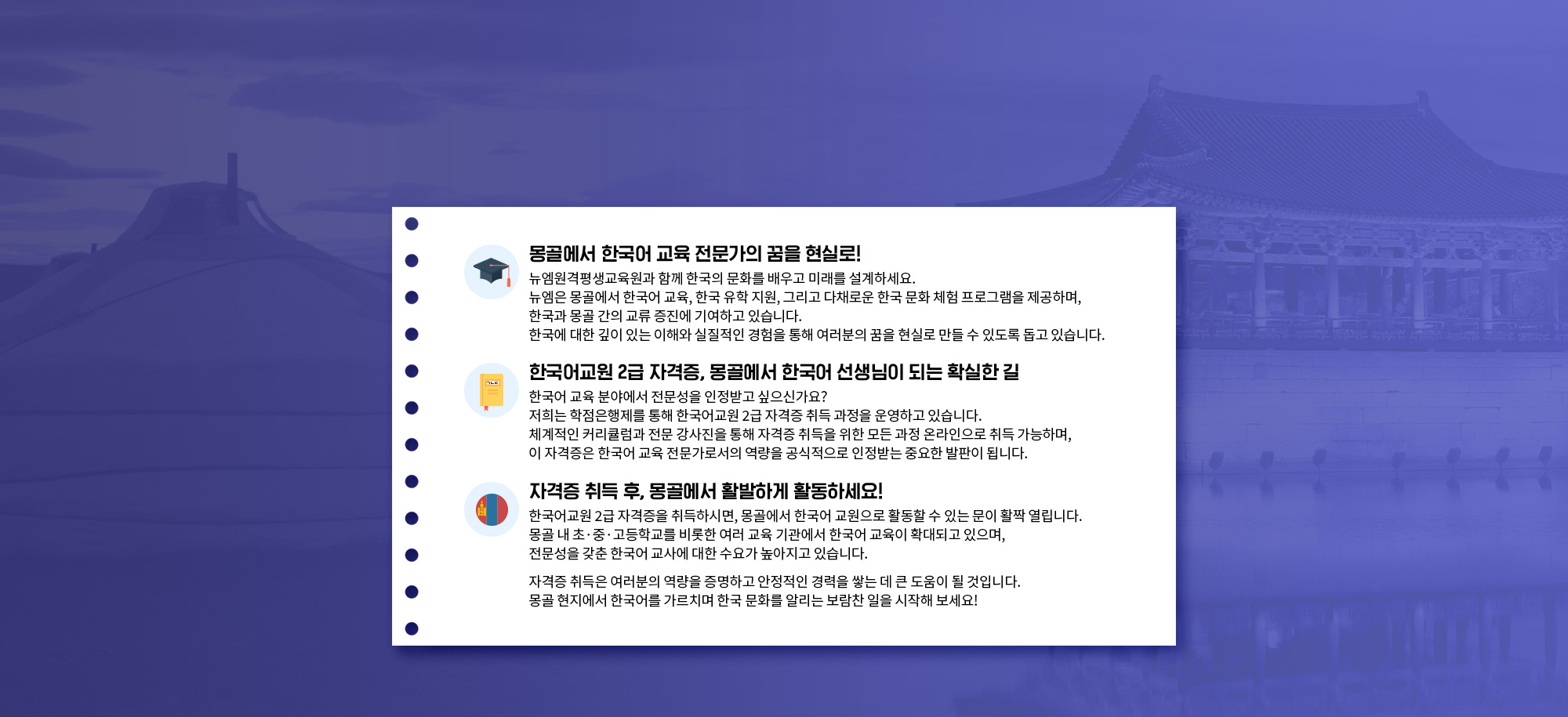 ´º¿¥¿ø°ÝÆò»ý±³À°¿ø ¸ù°ñ »ç¾÷ ÁøÃâ, Çѱ¹ À¯ÇÐ, Çѱ¹ ¹®È­ üÇè, ÀÇ·á °ü±¤ ±³À°À» ³Ñ¾î¼± ¹®È­ ±³·ùÀÇ ±âȸ, ¸ù°ñ¿¡¼­ Çѱ¹¾î ±³À° Àü¹®°¡ÀÇ ²ÞÀ» Çö½Ç·Î! , Çѱ¹¾î±³¿ø 2±Þ ÀÚ°ÝÁõ ¸ù°ñ¿¡¼­ Çѱ¹¾î ¼±»ý´ÔÀÌ µÇ´Â È®½ÇÇÑ ±æ, ÀÚ°ÝÁõ Ãëµæ ÈÄ ¸ù°ñ¿¡¼­ Ȱ¹ßÇÏ°Ô È°µ¿Çϼ¼¿ä ¿Ö ´º¿¥°ú ÇÔ²²ÇØ¾ß ÇÒ±î¿ä? 1. ½Å·ÚÇÒ ¼ö ÀÖ´Â ±³À°, ÇÐÁ¡ÀºÇàÁ¦ Á¤½Ä °úÁ¤À» ÅëÇØ °ËÁõµÈ Çѱ¹¾î±³¿ø 2±Þ ÀÚ°ÝÁõ Ãëµæ!, 2. ÇöÁö Àü¹®°¡ÀÇ Á¶¾ð ¸ù°ñ ÇöÁö ±³À° ȯ°æ ¹× Ãë¾÷ Á¤º¸¿¡ ´ëÇÑ ½ÇÁúÀûÀÎ µµ¿ò! 3.dzºÎÇÑ °æÇè, Çѱ¹ À¯ÇÐ ¹× ¹®È­ üÇè ÇÁ·Î±×·¥À» ÅëÇØ ½×Àº ³ëÇÏ¿ì·Î ¿©·¯ºÐÀÇ ¼ºÀåÀ» Áö¿ø! ¸ù°ñ ¹®È­ Ž¹æ ¹× ÇØ¿ÜºÀ»çÀÚ ¸ðÁý, ¸ù°ñ ¹®È­Å½¹æ ¹× ºÀ»çȰµ¿ °èȹ