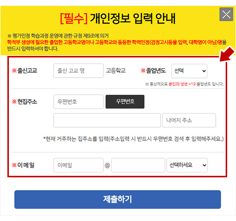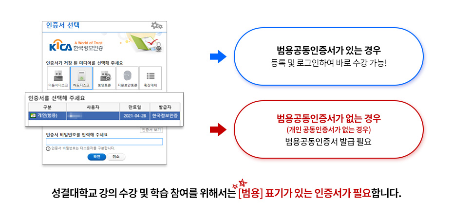 국가평생교육진흥원 학사관리지침 및 전자서명법(제10조 준수)에 따라 개인정보 보안과 대리출석 차단 및 부정행위 방지를 위해 2012년 7월 1일부터 범용공동인증서 사용을 전면적으로 실시합니다.