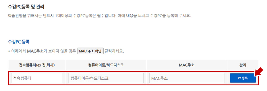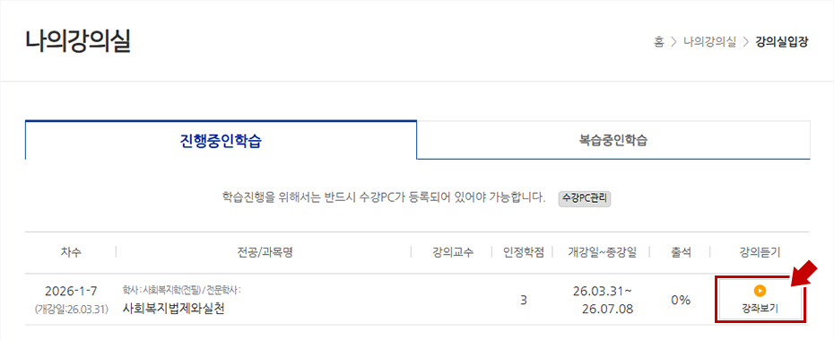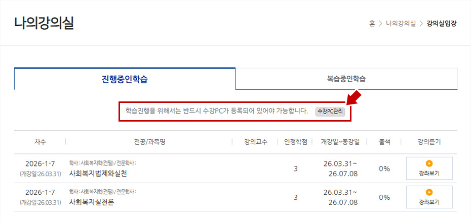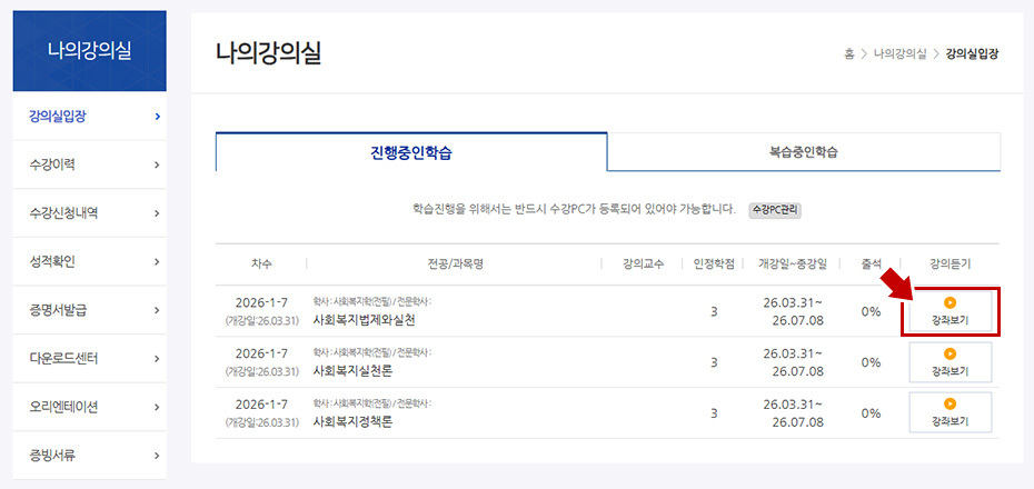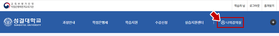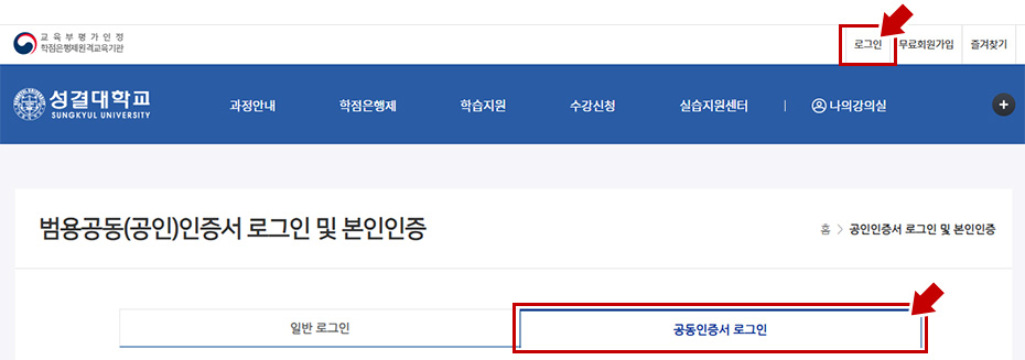 범용공동(공인)인증서 로그인 후 나의 강의실 접속