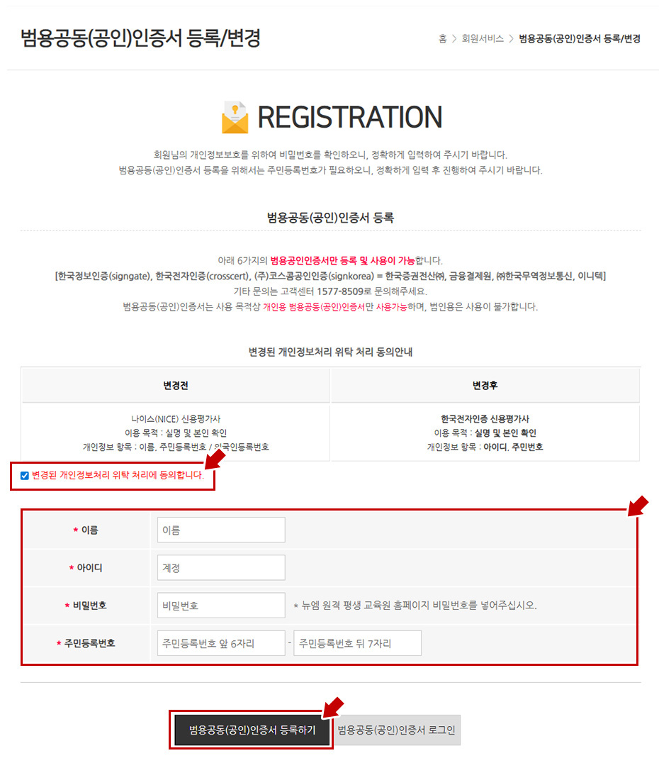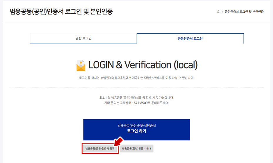사이트 상단 로그인 클릭 > 공동인증서 등록