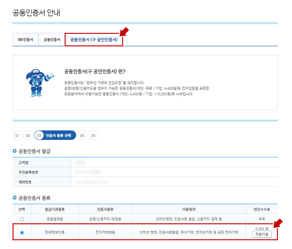 거래은행 개인공동인증서 센터 페이지에 접속하여 범용공동인증서 발급 (* 발급수수료 4,400원 / 년) 또는