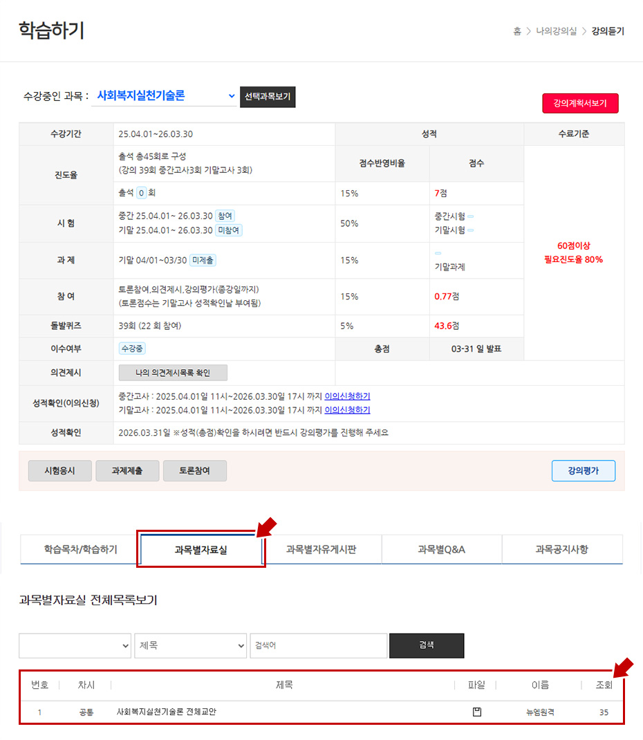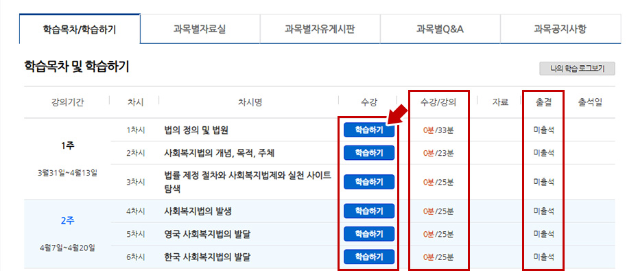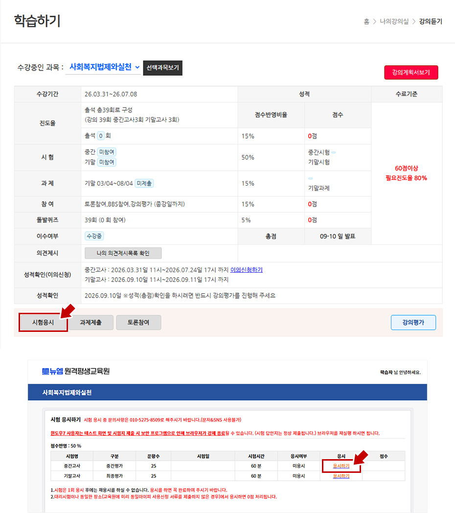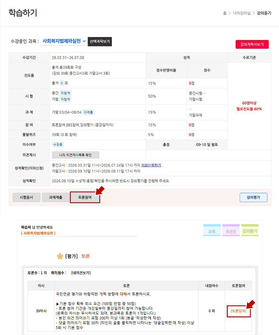 | 온라인 출석 | 중간고사 | 기말고사 | 과제 | 토론 | 퀴즈 | 의견제시 | 설문참여 |